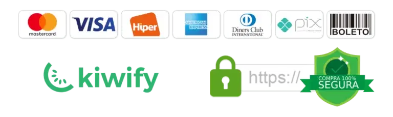Seu pagamento é processado pela Kiwify, com garantia incondicional de 30 dias. Se não gostar, seu dinheiro é devolvido sem burocracia.